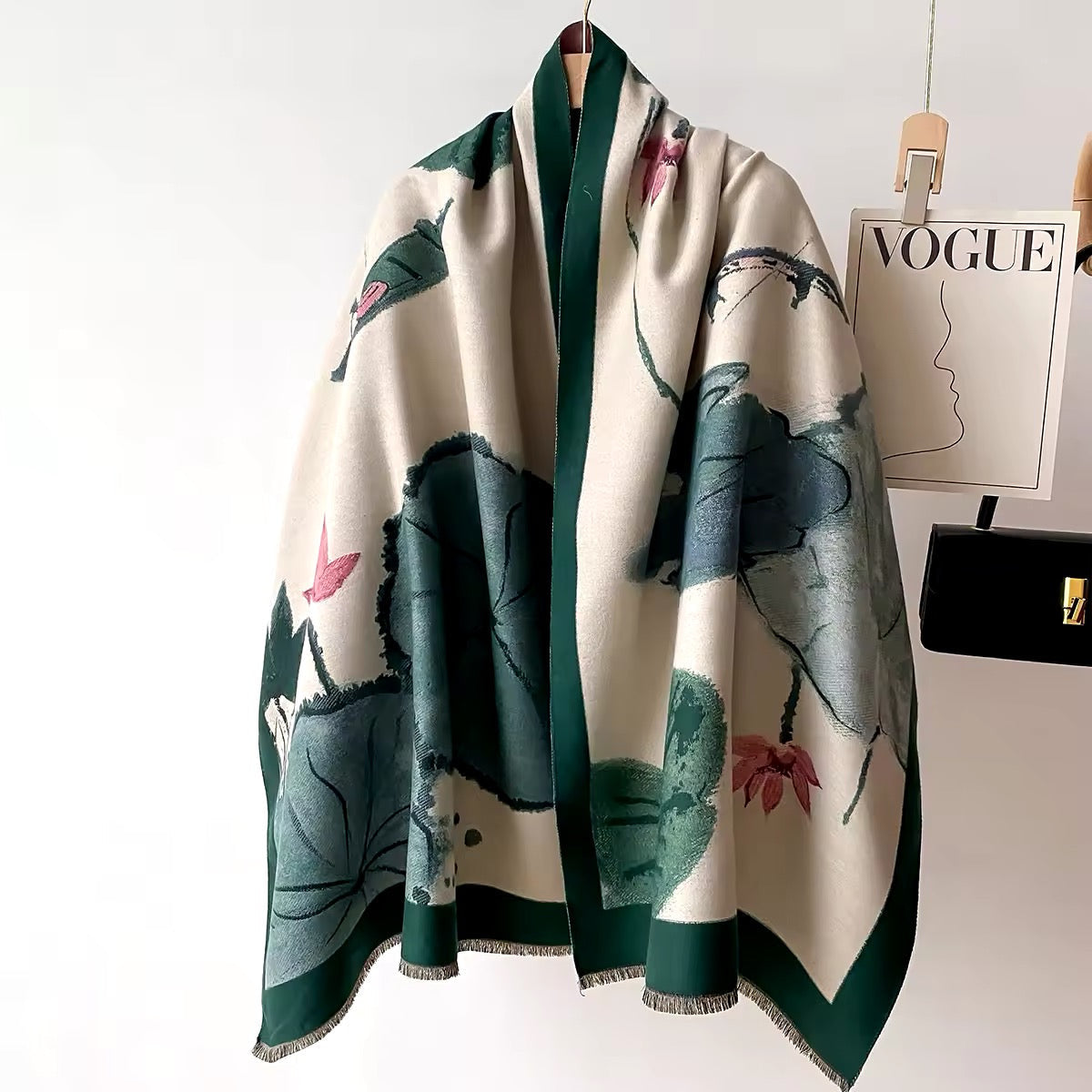 "Upgrade your scarf game with our New Luxury Lotus Floral Cashmere touch Scarf. Made from the softest cashmere, this pashmina shawl adds a touch of warmth and elegance to any outfit. Measuring 65x180 cm, it's perfect for all seasons. The eye-catching floral design makes it a great holiday gift for your loved ones in the UK."