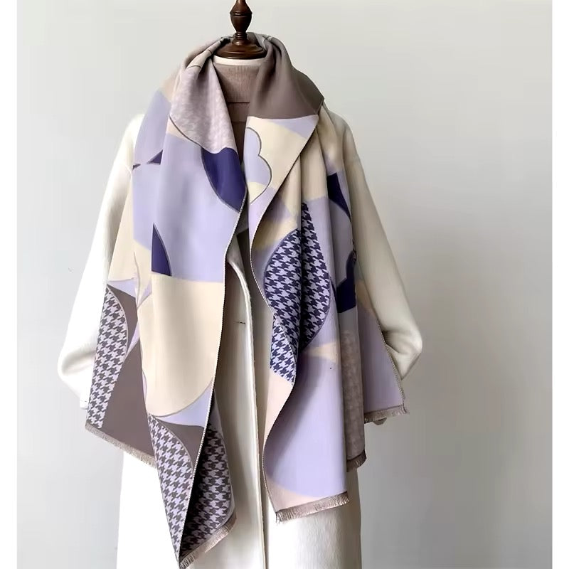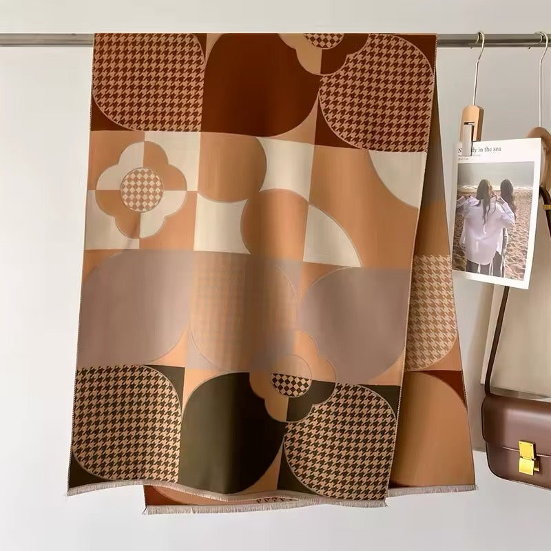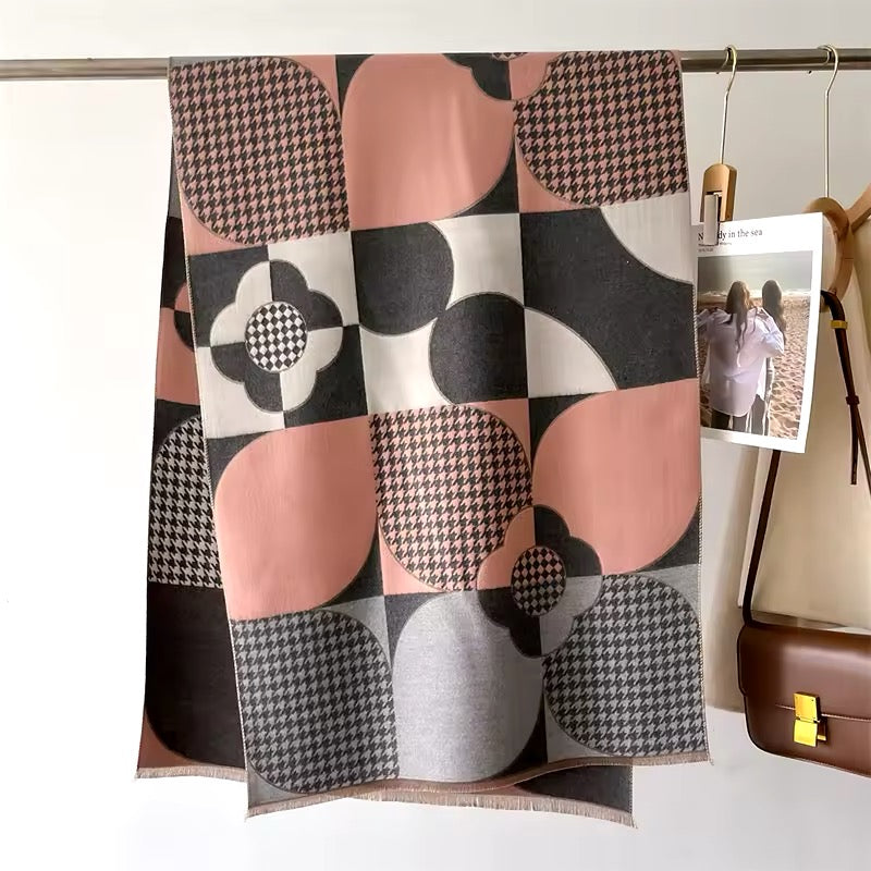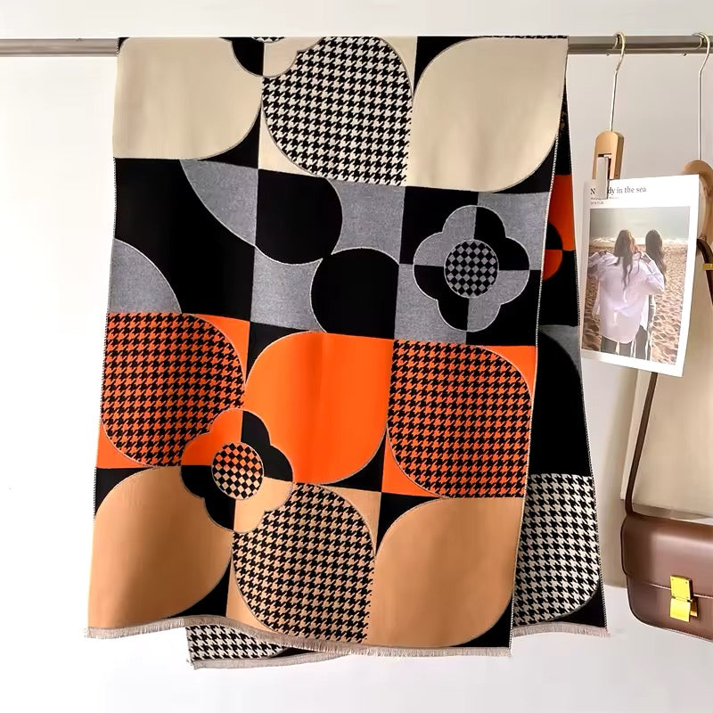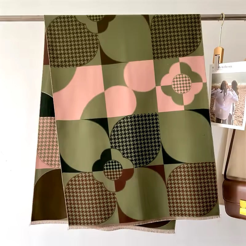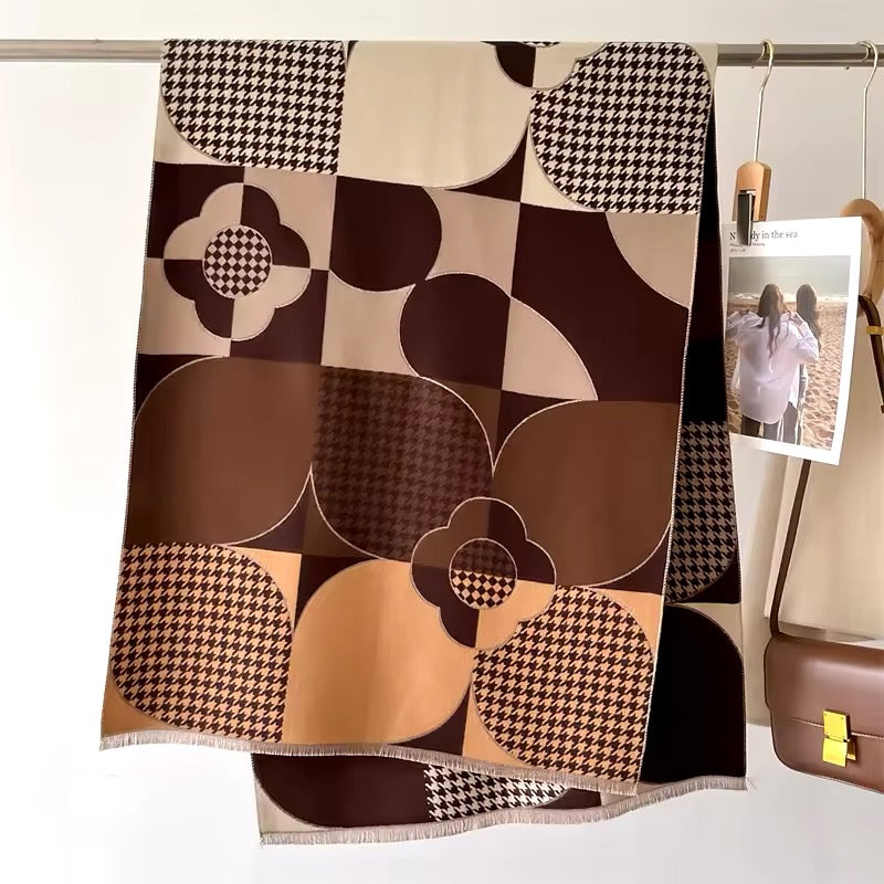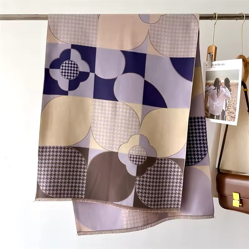 "Upgrade your scarf game with our New Luxury Floral Geometrical Cashmere touch Scarf. Made from the softest cashmere, this pashmina shawl adds a touch of warmth and elegance to any outfit. Measuring 65x180 cm, it's perfect for all seasons. The eye-catching floral design makes it a great holiday gift for your loved ones in the UK."