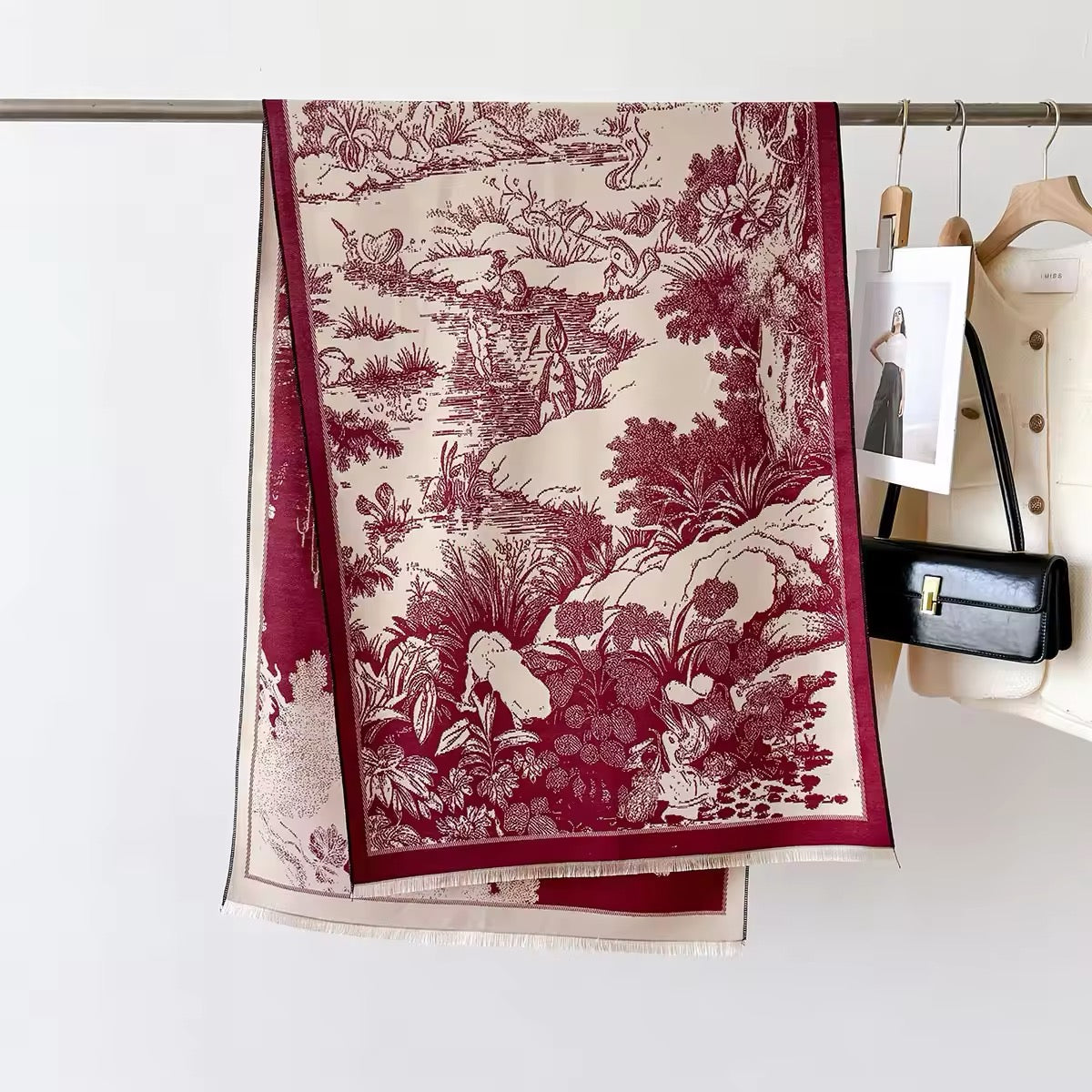 Luxury Women Floral Cashmere Touch Landscape Scarf - Warm Fringe Shawl