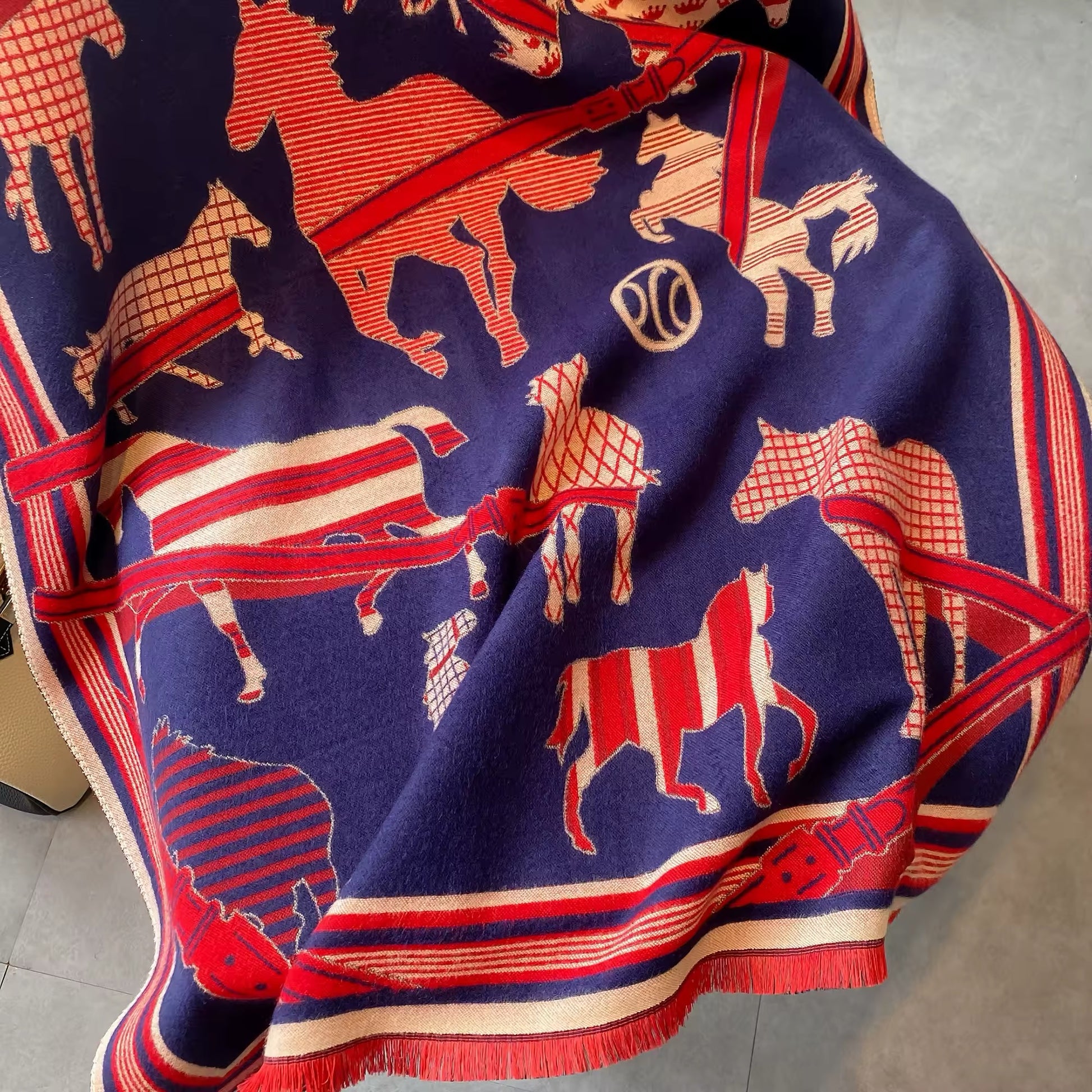 Luxury Women Limited Edition Horse Design Cashmere Touch Scarf - Warm Fringe Shawl