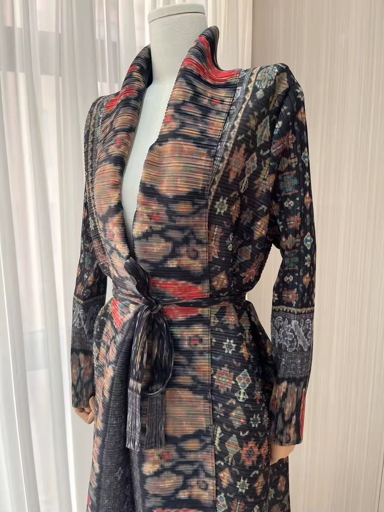 Women Split Abaya Vintage Printed Design Lapel Long Sleeved Open Front Cardigan Loose Big Collar