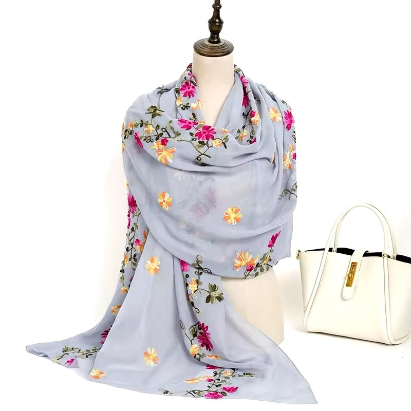 This elegant and versatile scarf features delicate embroidered begonia flowers, perfect for adding a touch of sophistication to any outfit. The generous size of 180x90 cm allows for versatile styling, while also providing protection from the summer sun. Elevate your fashion game with this stunning scarf.